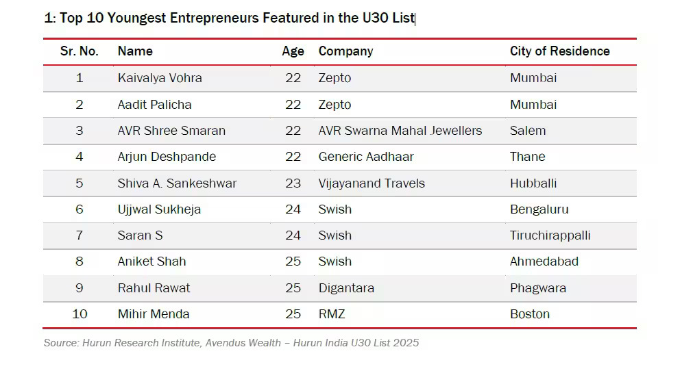 Kaivalya Vohra and Aadit Palicha, co-founders of quick commerce unicorn Zepto, have been named the youngest entrepreneurs on the inaugural Avendus Wealth–Hurun India U30 List 2025. At just 22, the duo represents India’s emerging wave of young, self-made startup founders reshaping the business landscape.